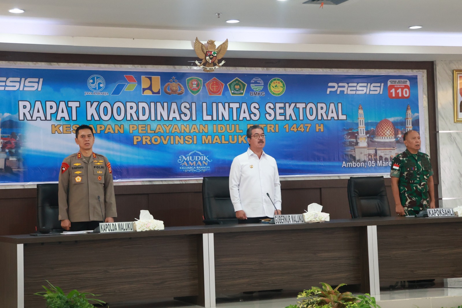 Ambon, Media Center Maluku – Menjelang Hari Raya Idul Fitri 1447 Hijriah Tahun 2026, Gubernur Maluku menghadiri Rapat Koordinasi Lintas Sektoral “Operasi Ketupat Salawaku 2026” dalam rangka kesiapan pengamanan mudik dan perayaan Idul Fitri yang berlangsung di Aula Basudara Manise Polda Maluku, Kamis (5/03/2026).