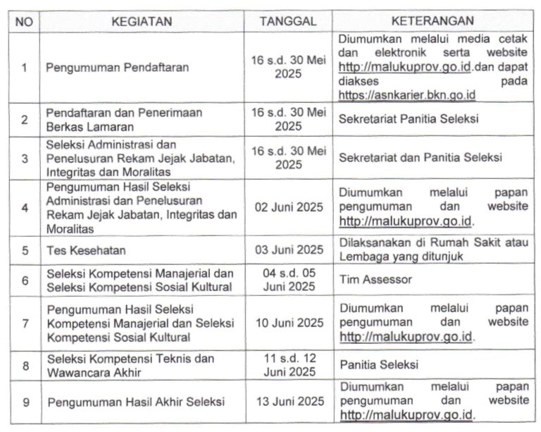 Informasi lebih lanjut dapat diperoleh pada website malukuprov.go.id atau Sekretariat Panitia Seleksi. (Diskominfo Maluku)