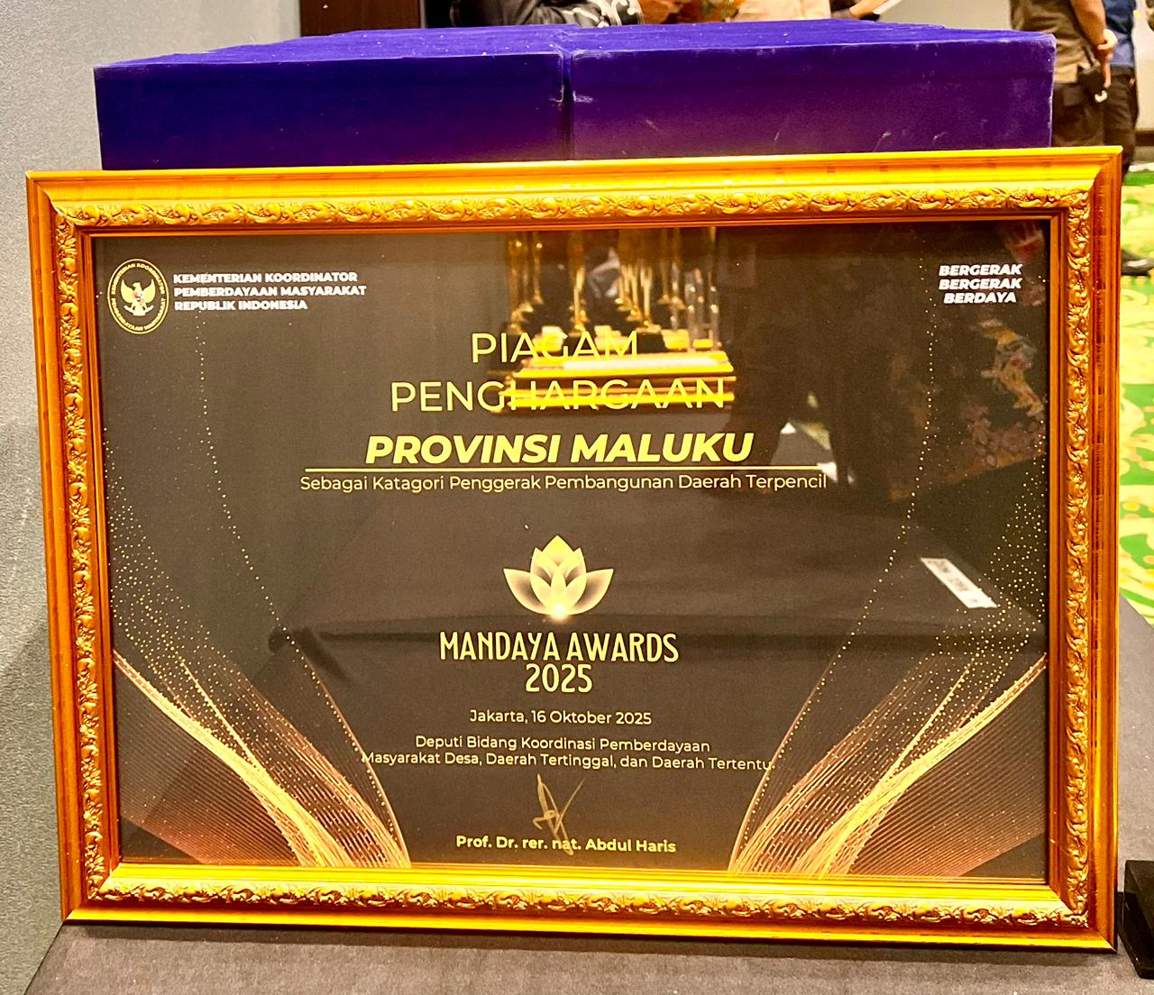 Jakarta, Media Center Maluku — Provinsi Maluku meraih peringkat kedua dalam kategori Penggerak Daerah Terpencil pada ajang Mandaya Awards 2025 yang diselenggarakan oleh Kementerian Koordinator Bidang Pemberdayaan Masyarakat Republik Indonesia, bertempat di Ballroom Lantai 6, Plaza Jamsostek, Kamis (16/10/2025).