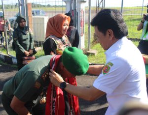 Ambon, Media Center Maluku – Tiba di Bandar Udara Pattimura Ambon, Pangdam XV/Pattimura Mayjen TNI Putranto Gatot Sri Handoyo didampingi istri Henny Putranto, disambut oleh Penjabat Gubernur Maluku Sadali Ie dan Forkopimda Provinsi Maluku beserta rombongan, pada Rabu (25/9/2024).
